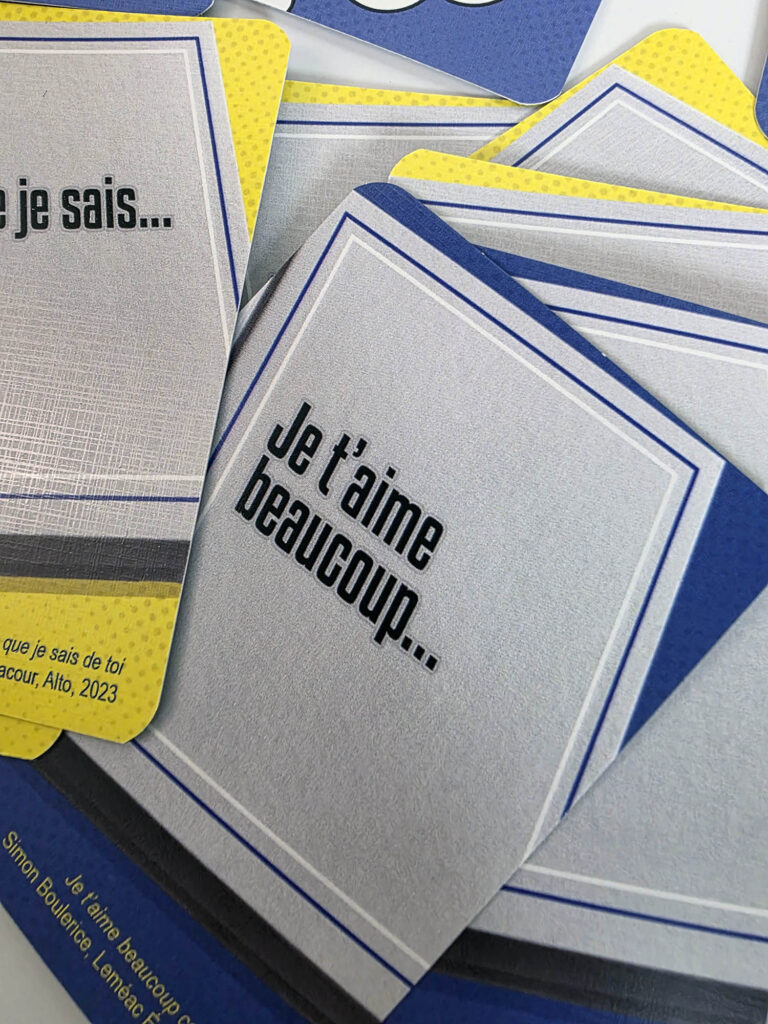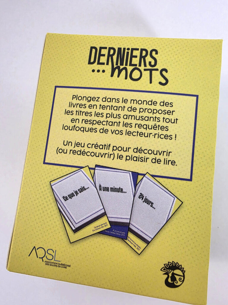 Avec Derniers mots de Marc-Antoine Doyon produit par l’AQSL (Association québécoise des salons du livre (AQSL)), nous avons cherché à créer une expérience chaleureuse et immédiate, capable de rejoindre autant les enfants que les familles, les milieux scolaires ou les contextes d’animation culturelle. Le jeu repose sur une prémisse simple : proposer des titres de livres en respectant certaines contraintes ou en répondant à des demandes loufoques formulées par les lecteurs et lectrices. Cette simplicité fait sa force.