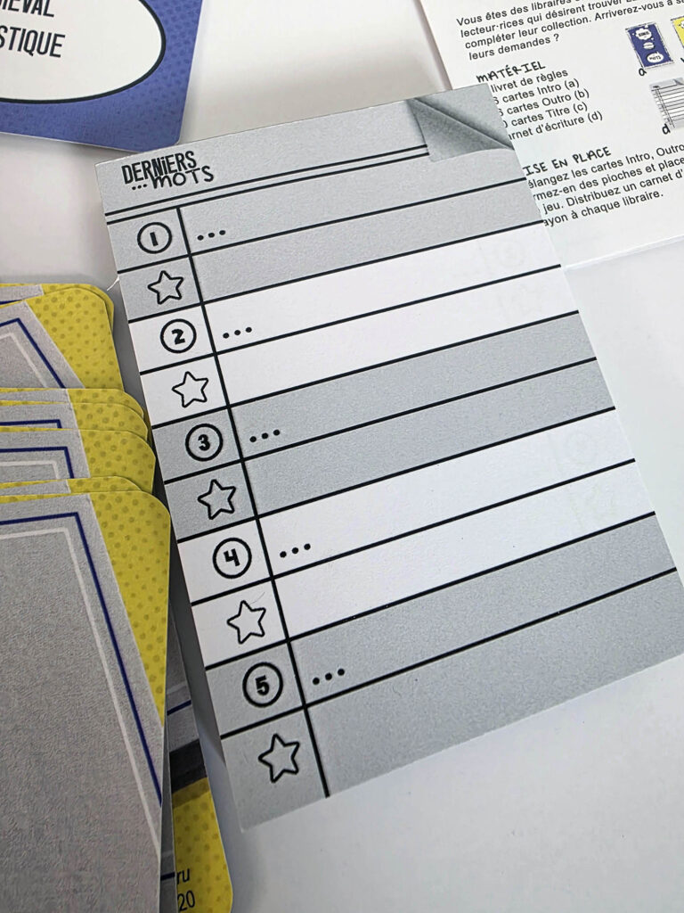 Par sa forme, Derniers mots se rapproche du jeu d’ambiance familial. Il est facile à expliquer, rapide à prendre en main et assez souple pour être utilisé dans différents contextes. Cette polyvalence en fait un outil particulièrement intéressant pour les événements autour du livre, les animations jeunesse et les activités de médiation culturelle.