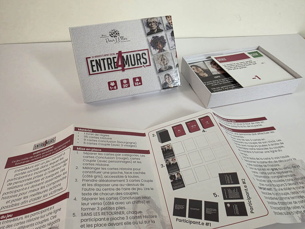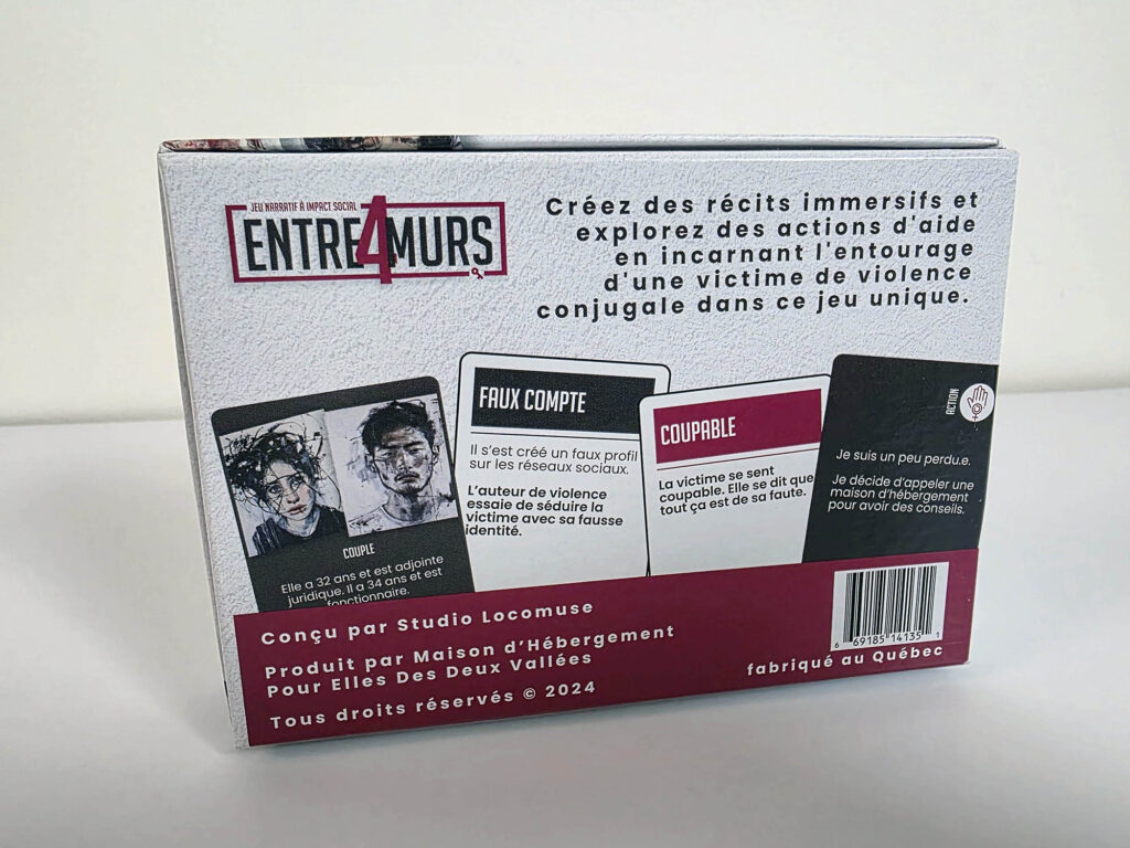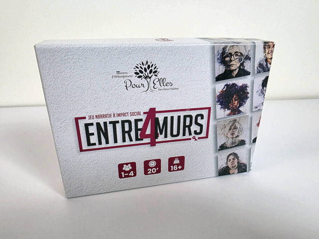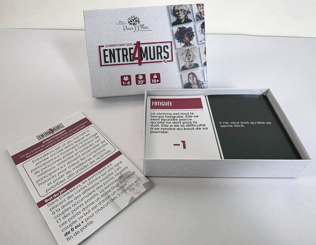 Avec Entre quatre murs (Jeu de société ”Entre 4 murs” – Maisons deux Vallées), l’objectif n’était pas seulement de transmettre de l’information, mais de permettre une véritable prise de conscience. La violence conjugale est un sujet lourd, délicat et profondément humain. Pour en parler de manière juste, il fallait une approche capable de préserver la nuance, de respecter la sensibilité du sujet et de faire émerger la réflexion sans tomber dans le sensationnalisme.