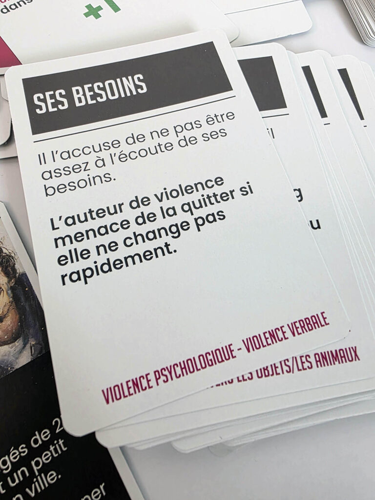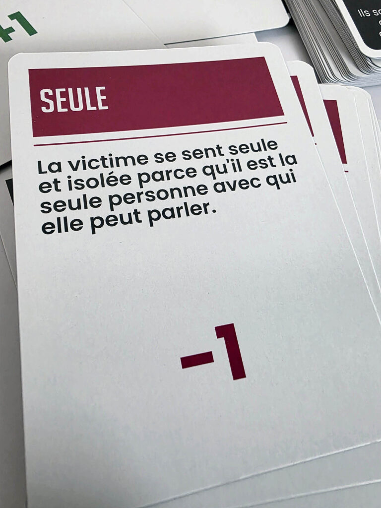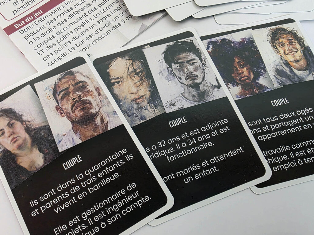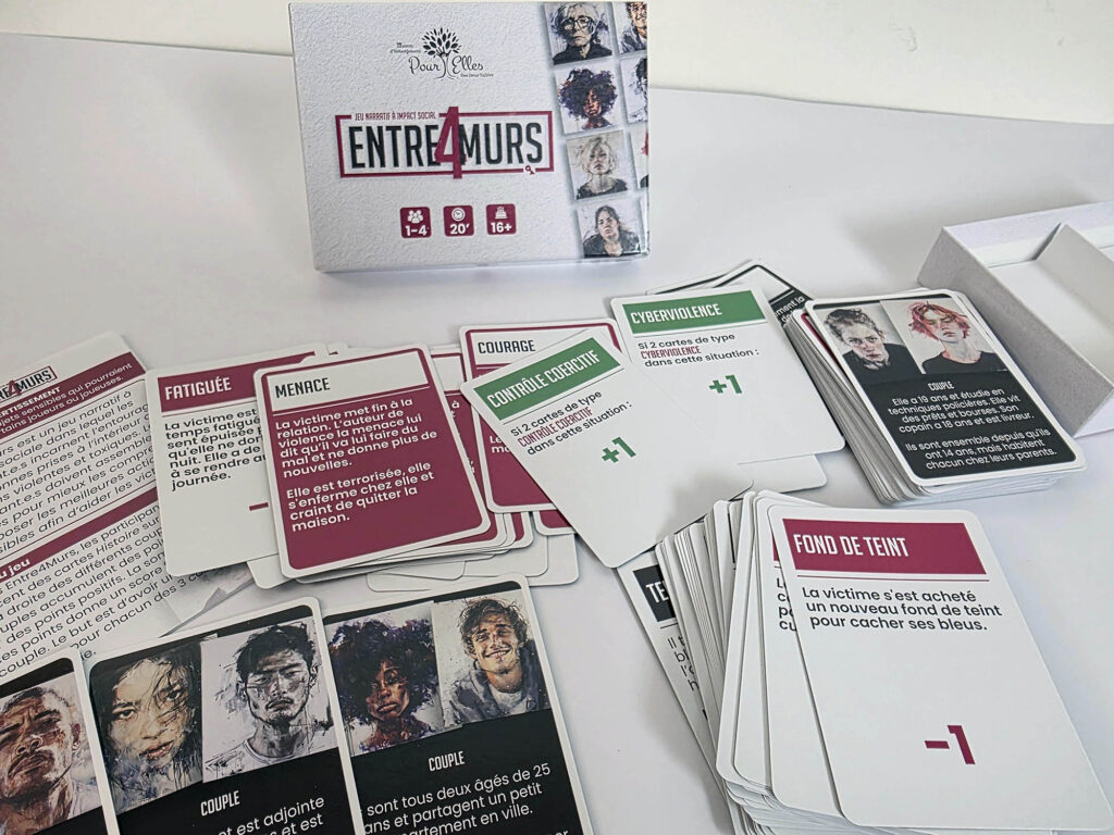 Avec Entre quatre murs (Jeu de société ”Entre 4 murs” – Maisons deux Vallées), l’objectif n’était pas seulement de transmettre de l’information, mais de permettre une véritable prise de conscience. La violence conjugale est un sujet lourd, délicat et profondément humain. Pour en parler de manière juste, il fallait une approche capable de préserver la nuance, de respecter la sensibilité du sujet et de faire émerger la réflexion sans tomber dans le sensationnalisme.